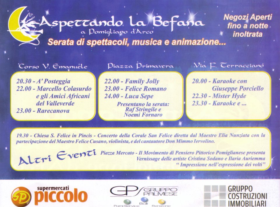 Aspettando la Befana a Pomigliano d'Arco Serata di spettacoli, musica ed animazione con negozi aperti fino a notte inoltrata
