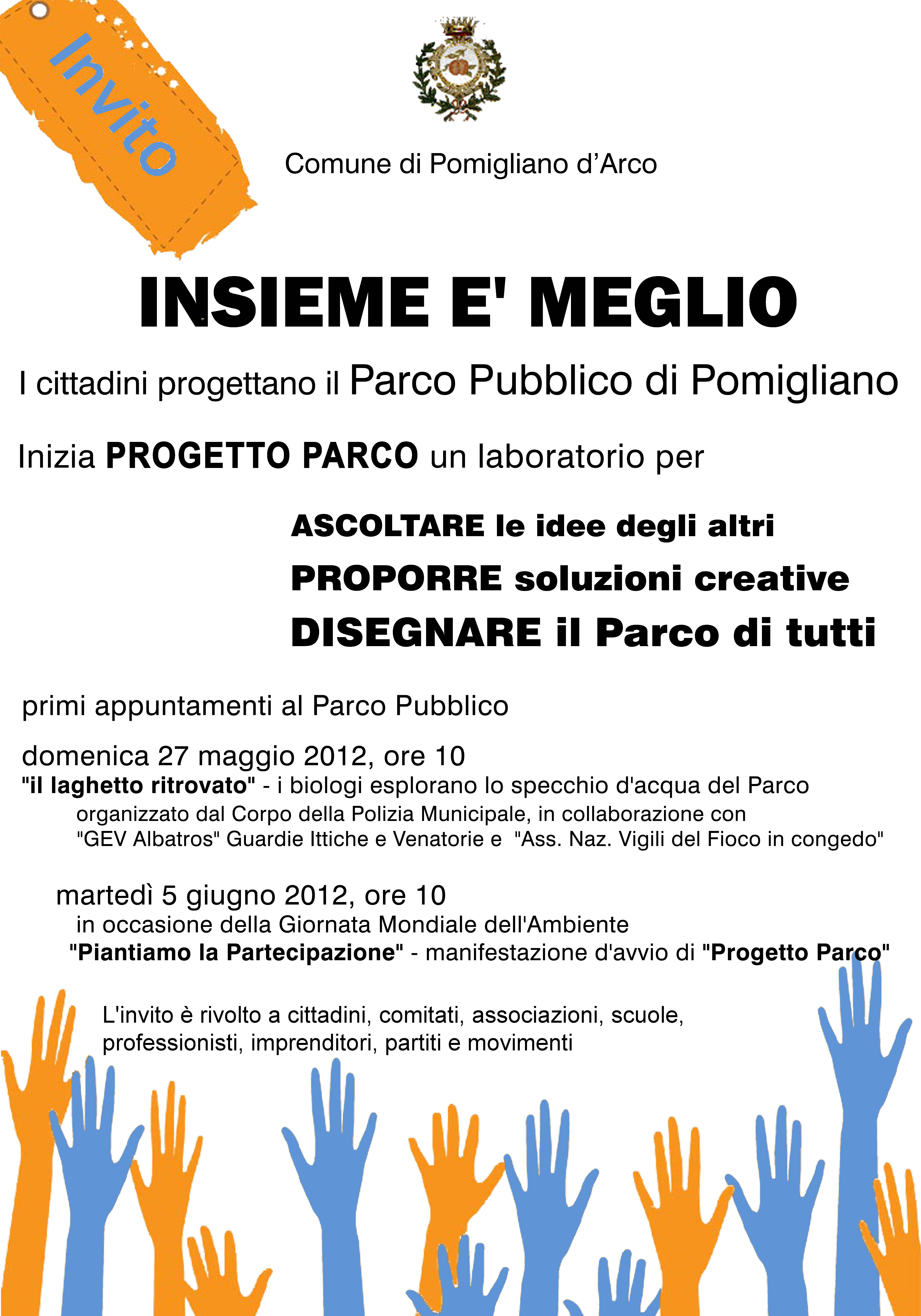 In allegato è possibile la consultazione sia del manifesto dell'iniziativa oltre che della Delibera di Giunta Comunale n°70 del 17/05/2012 avente ad oggetto "PROGETTO PARCO PUBBLICO” PRESA D’ATTO LINEE GUIDA PERCORSO PARTECIPATO, con il relativo allegato.