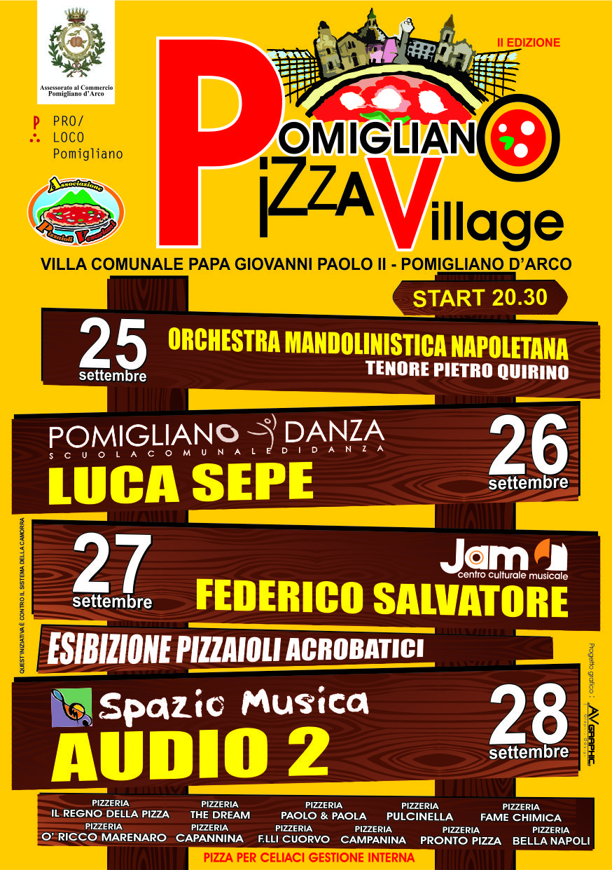 La seconda edizione del POMIGLIANO PIZZA VILLAGE che si terrà dal 25 al 28 Settembre, è stata organizzata dalla Pro Loco di Pomigliano d'Arco con il patrocincio del Comune di Pomigliano e con la collaborazione dell’Associazione Pizzaioli Vesuviani.