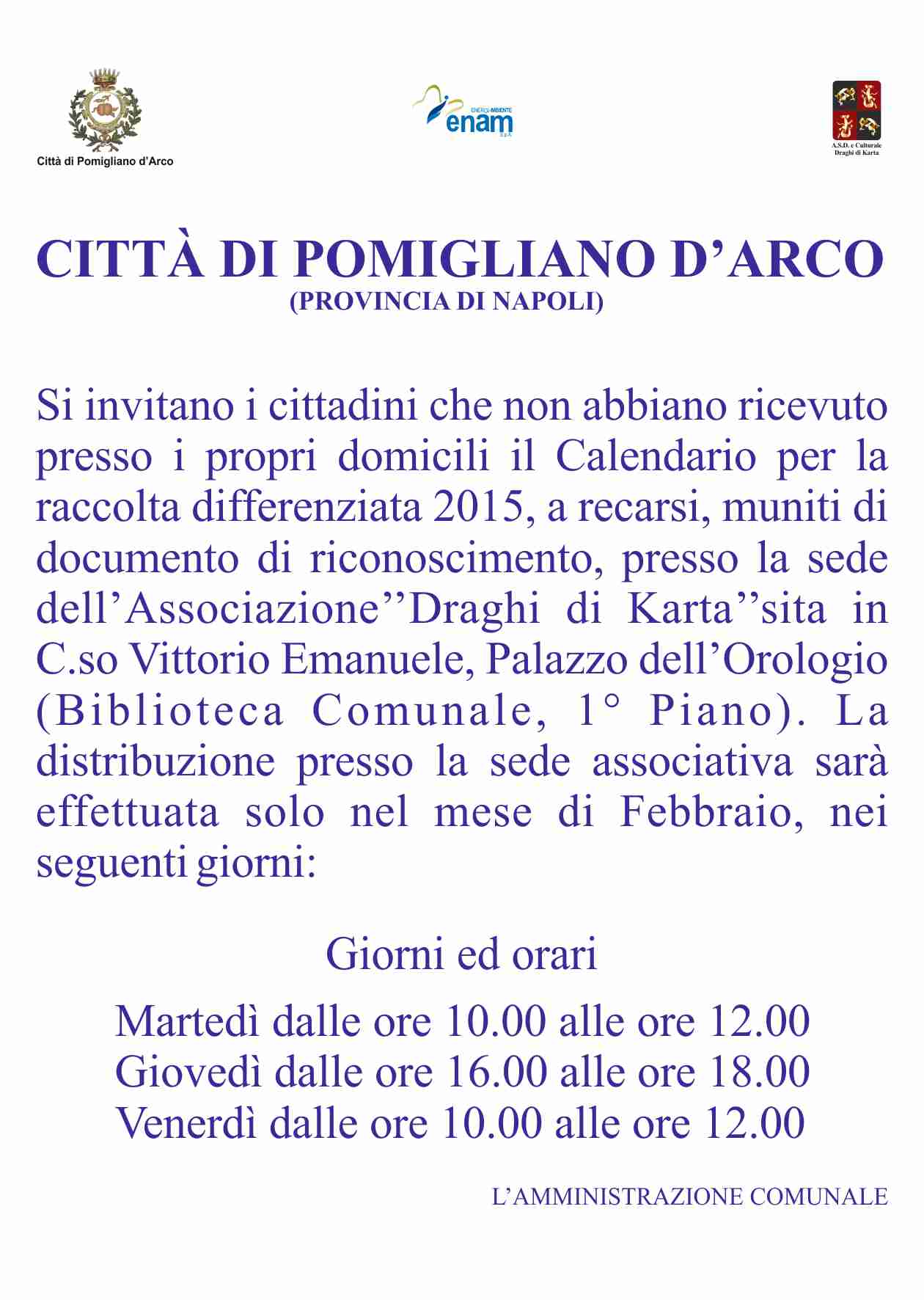 Coloro che non hanno ricevuto presso il proprio domicilio il Calendario per la raccolta differenziata 2015, possono recarsi presso la sede dell'Associazione "Draghi di Karta", sita presso il Palazzo Orologio in Corso Vittorio Emanuele, muniti di un documento di riconoscimento nei seguenti giorni e orari :