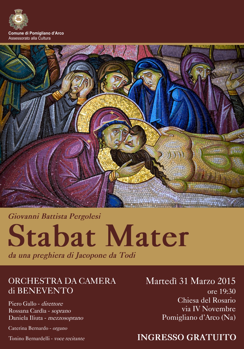 Martedì 31 marzo 2015, alle ore 19,30, presso la Chiesa del Rosario in Pomigliano d'Arco, si terrà il concerto di musica classica "Stabat Mater" di Gian Battista Pergolesi eseguito dall'Orchestra da Camera di Benevento.