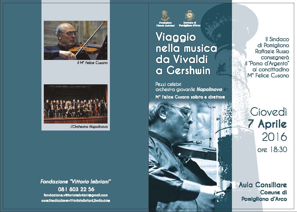 Giovedì 7 aprile, alle ore 18,30, nell'Aula Consiliare di Pomigliano d'Arco, la Fondazione "Vittorio Imbriani" presenta il Concerto del M° Felice Cusano, accompagnato dall'Orchestra Napolinova.