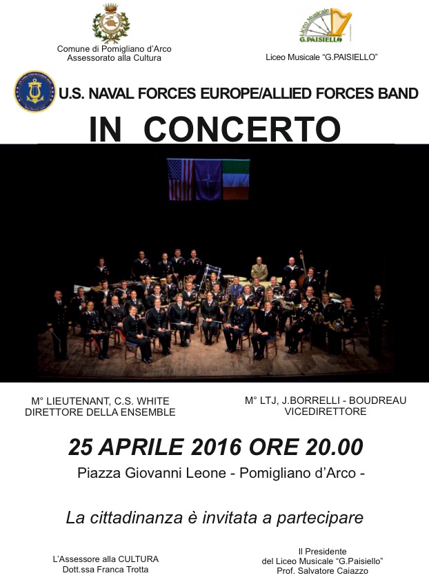 In occasione della festa della Liberazione del 25 aprile. Alle ore 20 si terrà un concerto di soli musicisti americani. Presso Piazza Giovanni Leone-Pomigliano d'Arco. Il programma della serata in allegato.