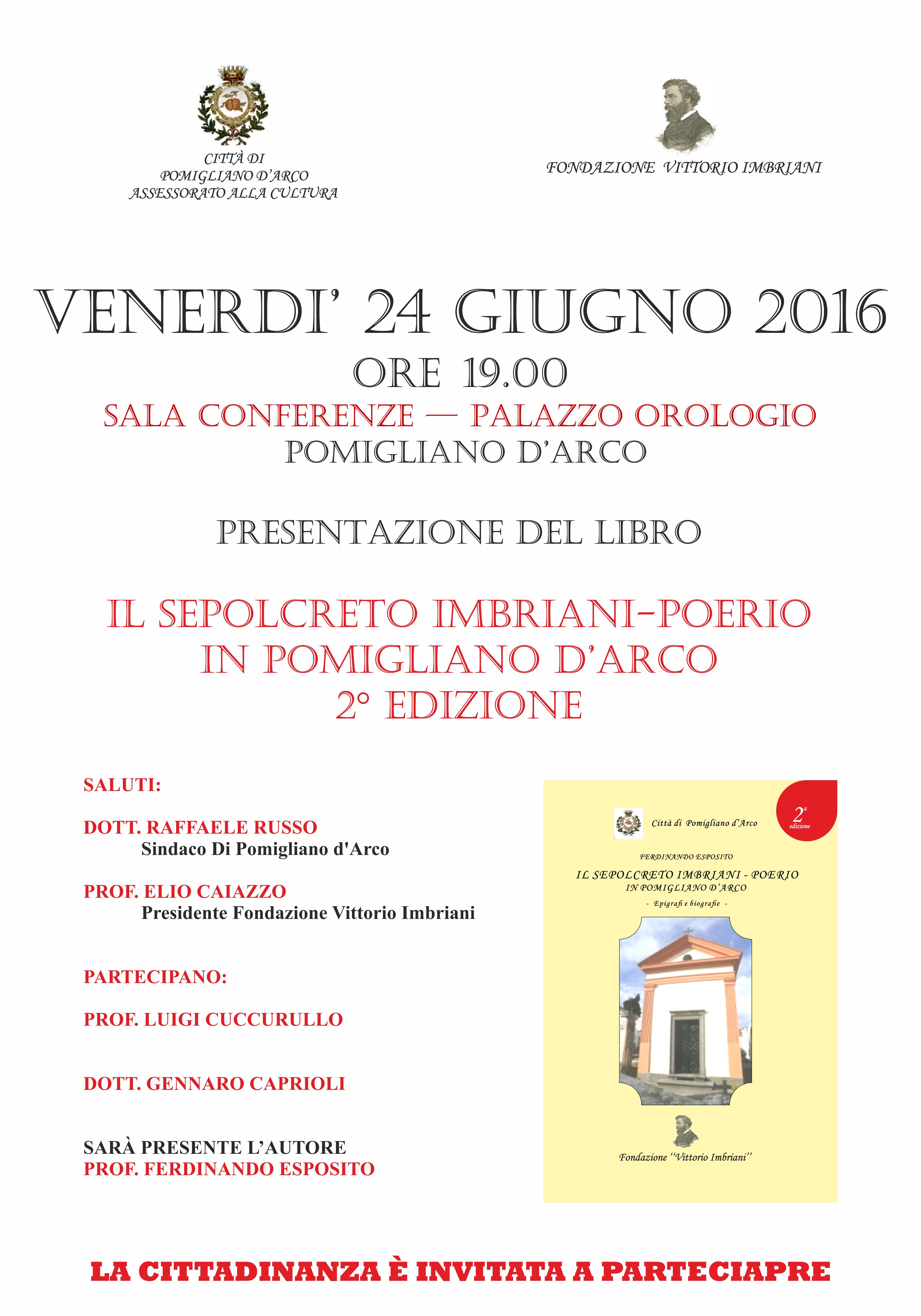 Si avvisa la Cittadinanza che venerdì 24 giugno 2016, presso il Palazzo dell’Orologio in Pomigliano d’Arco, ore 19, sarà presentato il libro del prof. Ferdinando Esposito, dal titolo “il Sepolcreto Imbriani-Poerio”, 2°edizione.