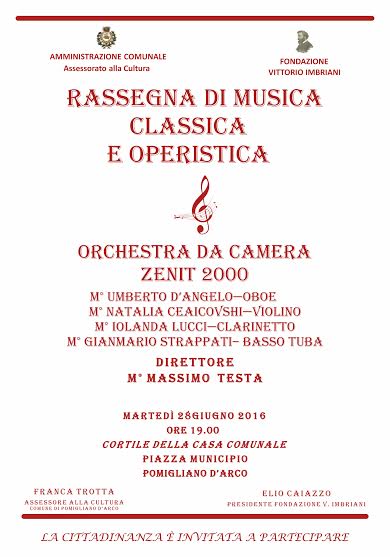 Si avvisa la Cittadinanza che martedì 28 giugno 2016, presso il cortile della casa comunale di Pomigliano d’Arco, alle ore 19, avremo l’orchestra del Maestro Massimo Testa.