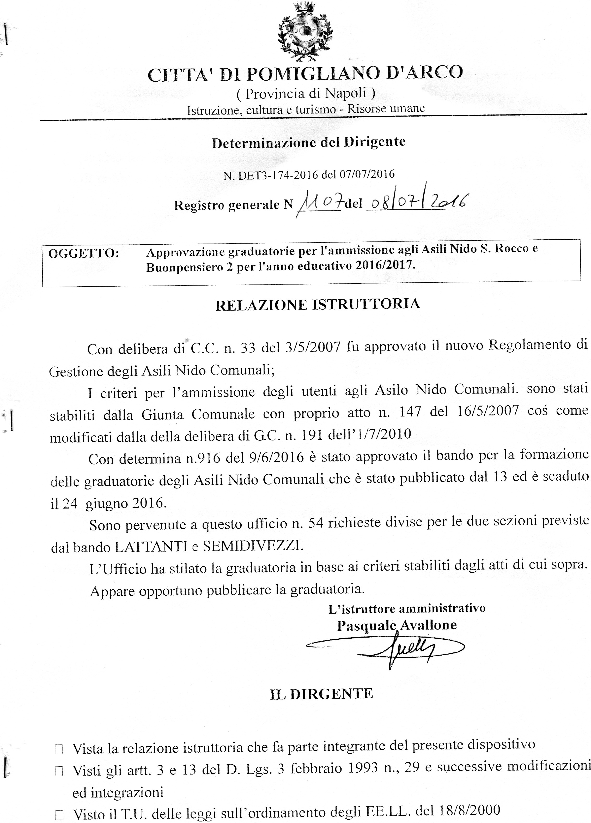 Si porta a conoscenza che con Determina Dirigenziale n.174 del 07/07/2016, n.1107 del Registro Generale dell'08/07/2016, esecutiva, è stata approvata la Graduatoria per l'Ammissione agli Asili Nido San Rocco e Buonpensiero 2 per l'Anno Accademico 2016/2017.