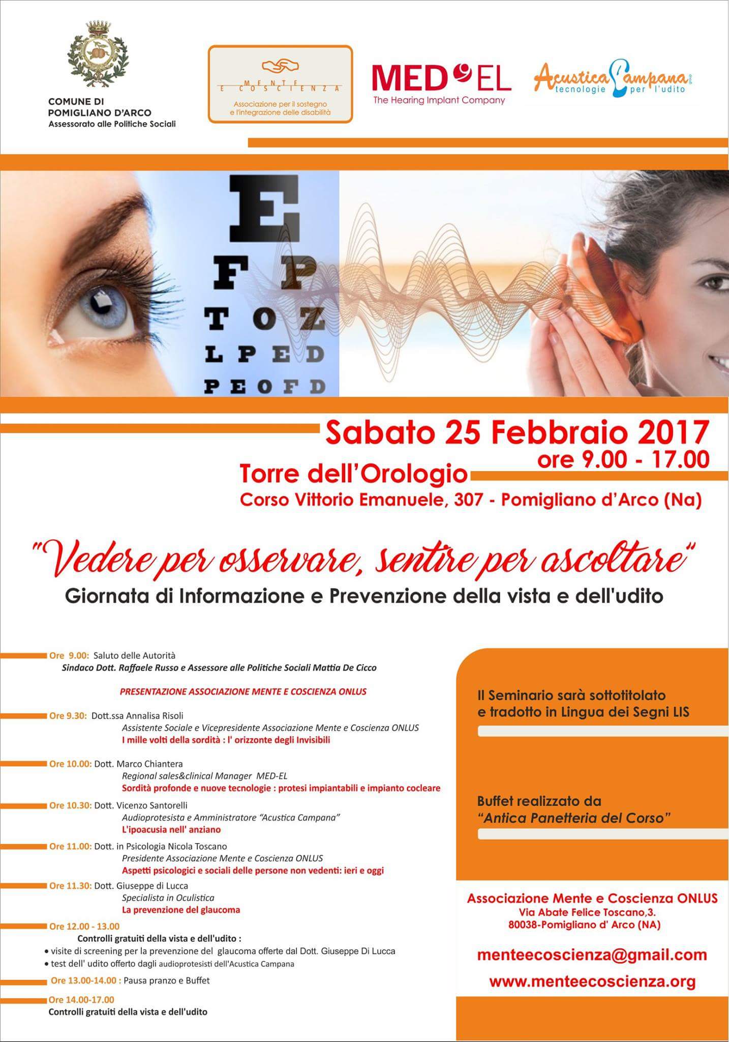 Presso il palazzo dell'Orologio in Pomigliano d'Arco, evento di prevenzione "vivere per osservare, sentire per ascoltare", organizzato dall'Assessorato alle Politiche Sociali e dall'Associazione Mente e Coscienza. Sabato 25 febbraio 2017, dalle ore 9 alle ore 17.