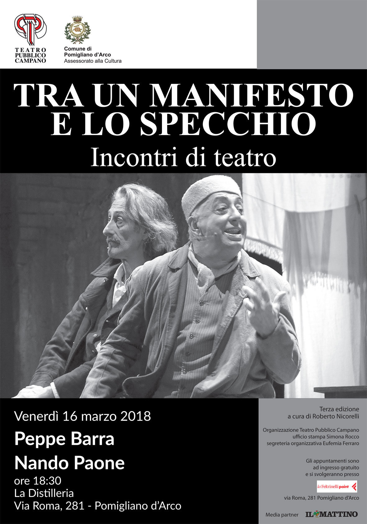 Venerdì 16 marzo, ultimo appuntamento di quest'anno col cartellone "Tra un manifesto e lo specchio": incontro con Peppe Barra e Nando Paone. I cittadini sono invitati a partecipare. Ingresso gratuito