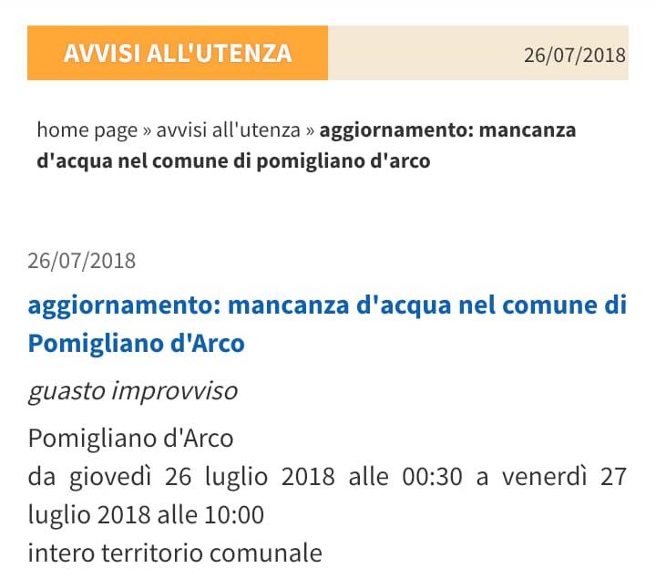 Nel frattempo il Comune di Pomigliano d’Arco ha predisposto per l’emergenza 4 postazioni dove rifornirsi di acqua: due autobotti in piazza Giovanni Leone e in Via Nazionale delle Puglie e due fontane in via Caruso ed in Via Terracciano.