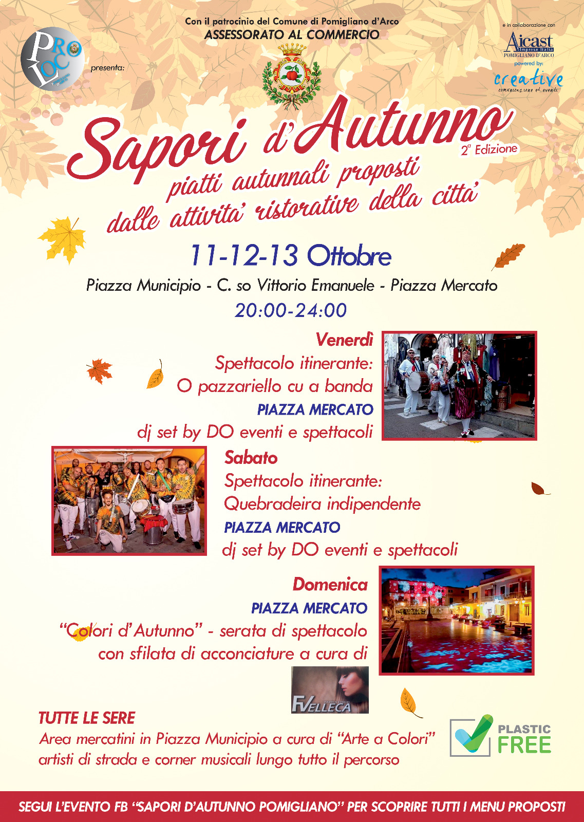 Un fine settimana da celebrare venerdì 11 ottobre con lo spettacolo itinerante di “O pazzariell cu a banda” di Pasquale Terracciano, poi il dj set in piazza Mercato di “Eventi e Spettacoli”. Si passa a sabato 12 con lo show dei Quebradeira Independente e ancora dj set in piazza Mercato. Domenica 13 una serata all’insegna dello spettacolo e della bellezza con la sfilata di acconciature e gli ospiti musicali sponsorizzati da FVelleca Parrucchieri. Tutte le sere protagonisti i mercatini di “Arte a Colori” in piazza Municipio e artisti di strada per una tre giorni tutta da vivere presentata dalla CreativEventi.