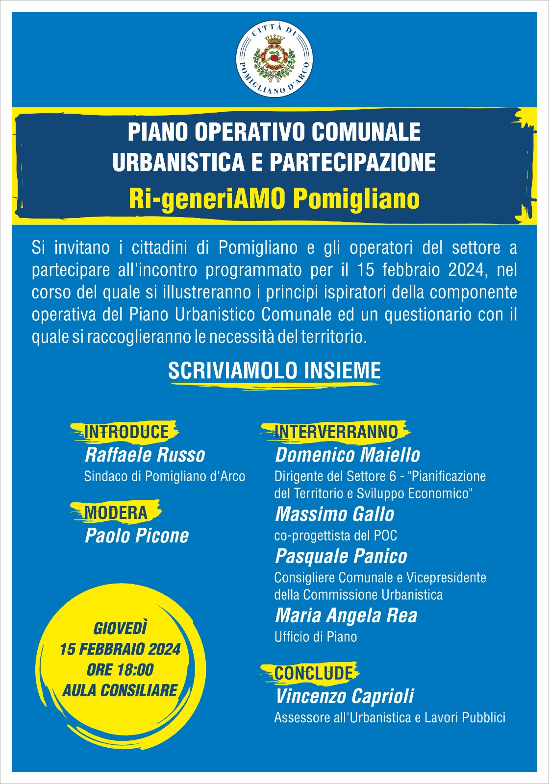 Questo pomeriggio, alle ore 18,00, presso la Sala Consiliare, verrà presentato il questionario “ri-generiAMO Pomigliano insieme”, promosso dall’Amministrazione comunale, nell’ambito del percorso di ascolto e coinvolgimento della cittadinanza per il completamento del Piano Urbanistico Comunale (PUC). L'iniziativa, nell'ambito della Conferenza di Pianificazione, ha l’obiettivo di raccogliere proposte e contributi finalizzati all’individuazione delle principali strategie che dovranno disciplinare ed orientare le priorità degli interventi di riqualificazione e di nuova edificazione su temi quali la rigenerazione urbana e riqualificazione dell’esistente, il contrasto ai cambiamenti climatici, la gestione dello spazio pubblico, gli investimenti sul territorio, e nello stesso tempo di comprendere come i cittadini valutino gli ambiti in cui abitano, dal punto di vista dei servizi di prossimità, degli spazi comuni, della qualità urbana e dell’abitare, ma anche come considerino i temi della mobilità, dell’ambiente, del paesaggio e dell’agricoltura.