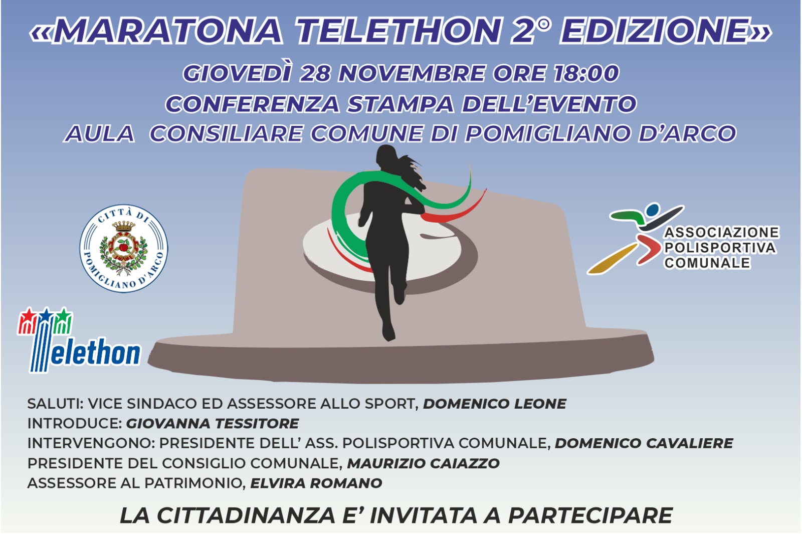 Giovedì 28 novembre, alle ore 18.00, presso l'Aula Consiliare del Comune di Pomigliano d’Arco, si terrà la conferenza stampa di presentazione della Maratona Telethon, un evento dedicato alla solidarietà e alla ricerca scientifica. La maratona si svolgerà domenica 1° dicembre 2024, presso il Parco Pubblico Giovanni Paolo II.