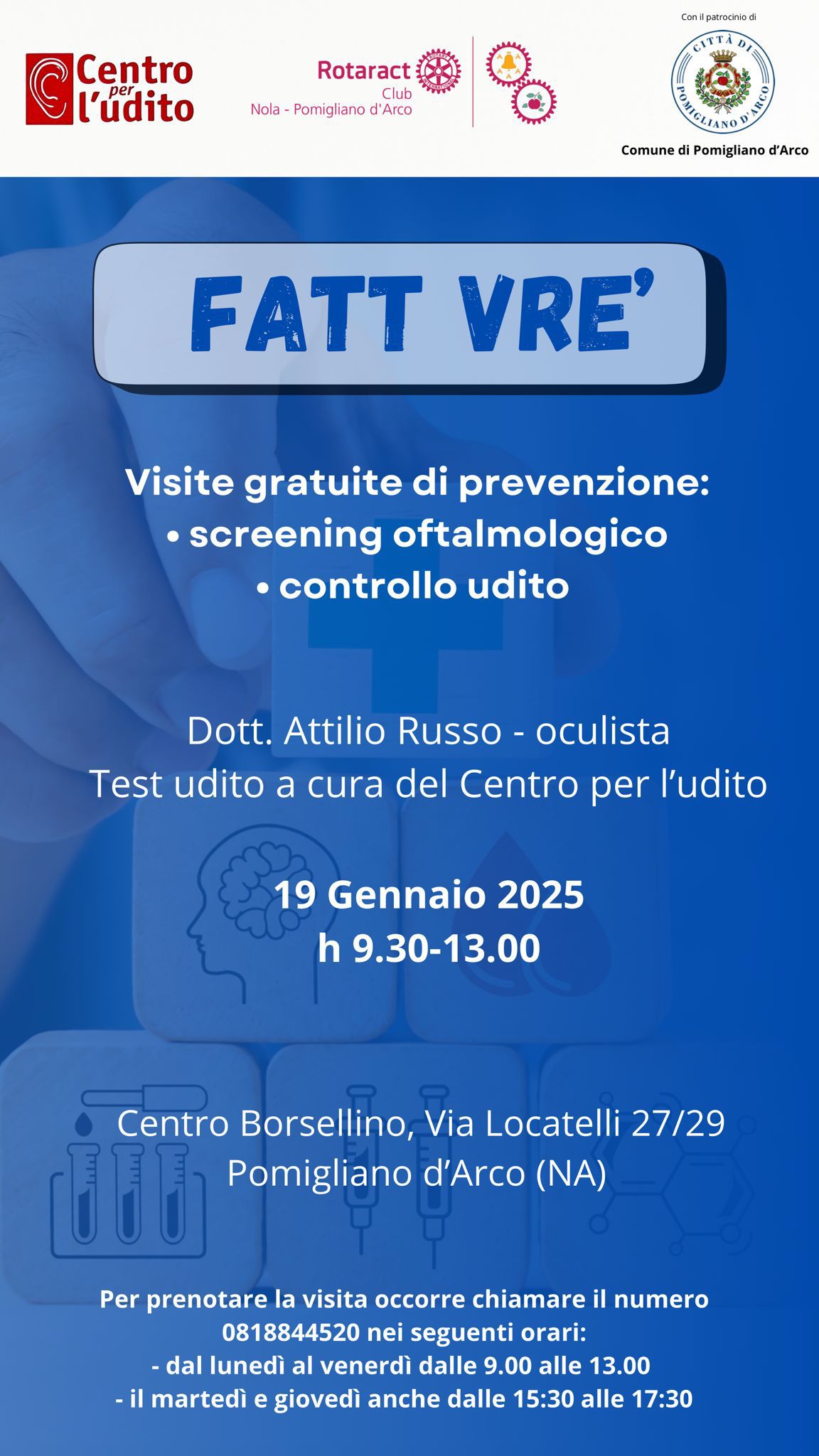 In attuazione alla Delibera di Giunta Comunale n. 274 del 06/12/2024 L’Assessorato alle Politiche Sociali presenta per il giorno 19 Gennaio 2025 una giornata di visite gratuite di prevenzione.