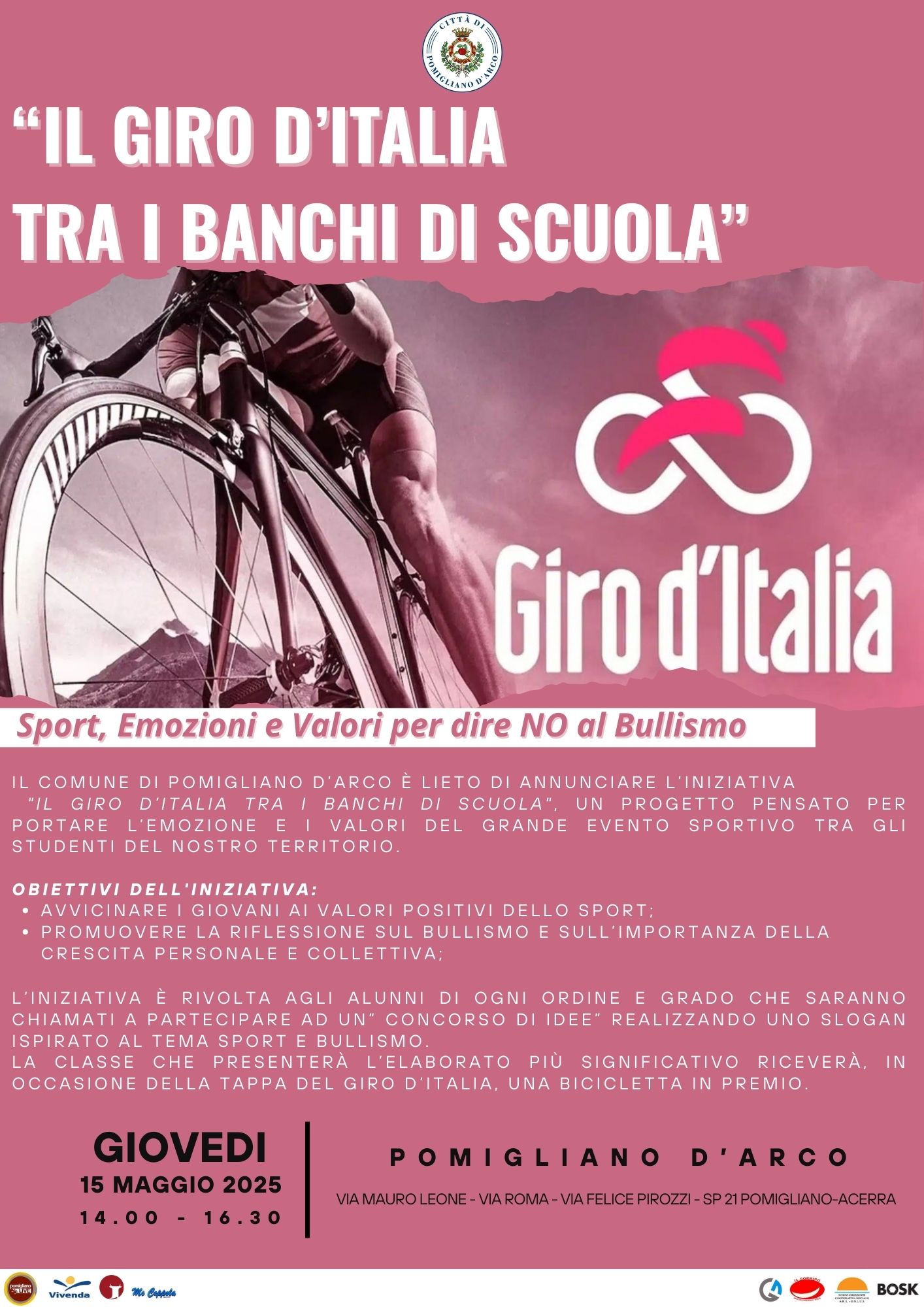 Il 15 maggio 2025, non sarà solo una data sul calendario sportivo, ma diventerà una festa educativa e sociale, grazie a un’iniziativa speciale: un contest contro il bullismo legato ai valori dello sport, promosso in occasione della tappa pomiglianese del Giro.