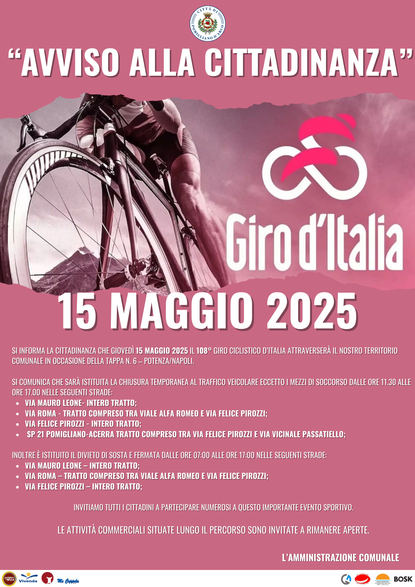 Pomigliano d’Arco si colora di rosa: il Giro d’Italia 2025 fa tappa in città