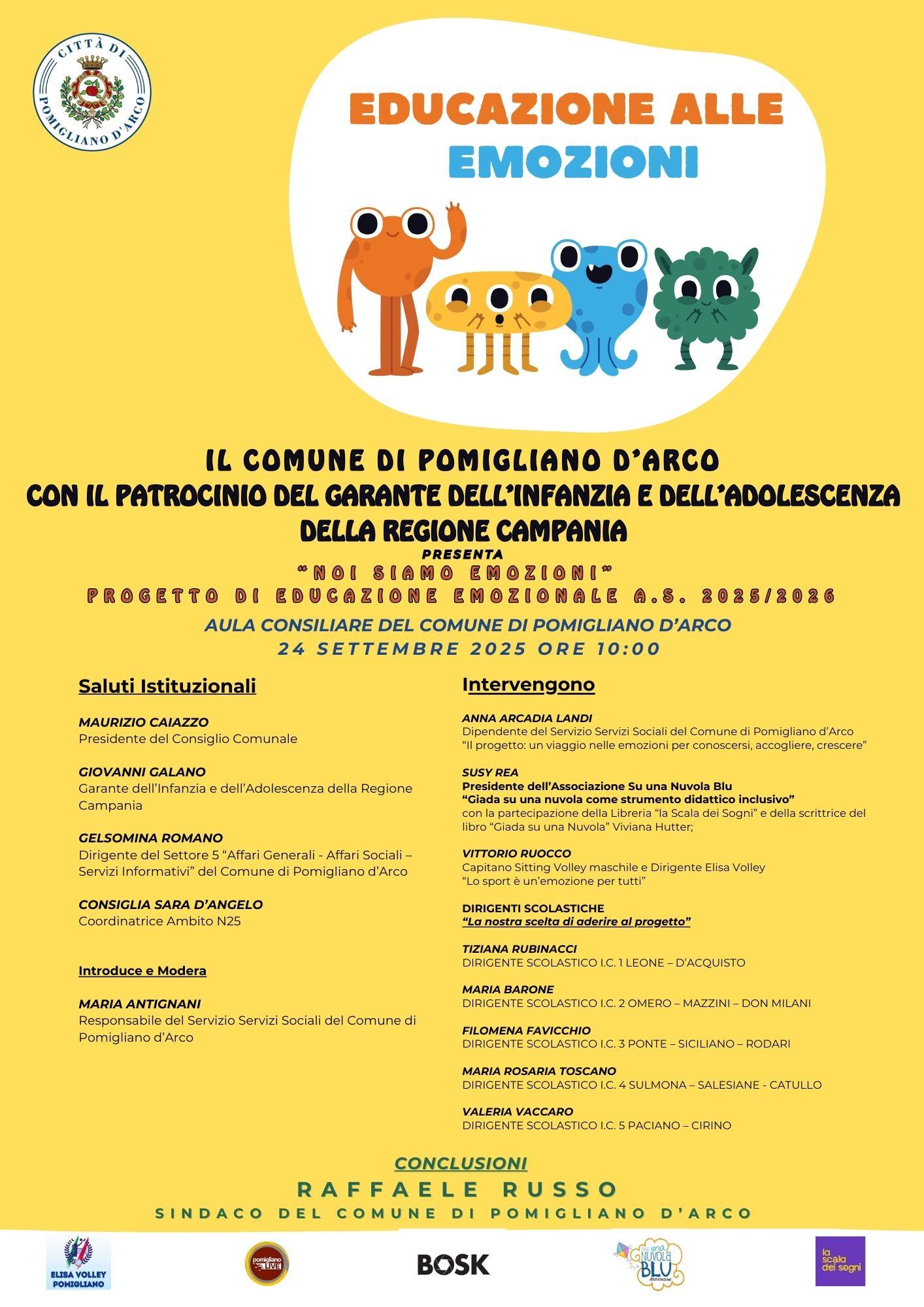 L’aula consiliare del Comune di Pomigliano d’Arco, in Piazza Municipio 1, il 24 settembre 2025 alle ore 10:00, spalancherà nuovamente le sue porte per la presentazione del progetto “Noi siamo emozioni”, rivolto alla fascia più giovane della città.