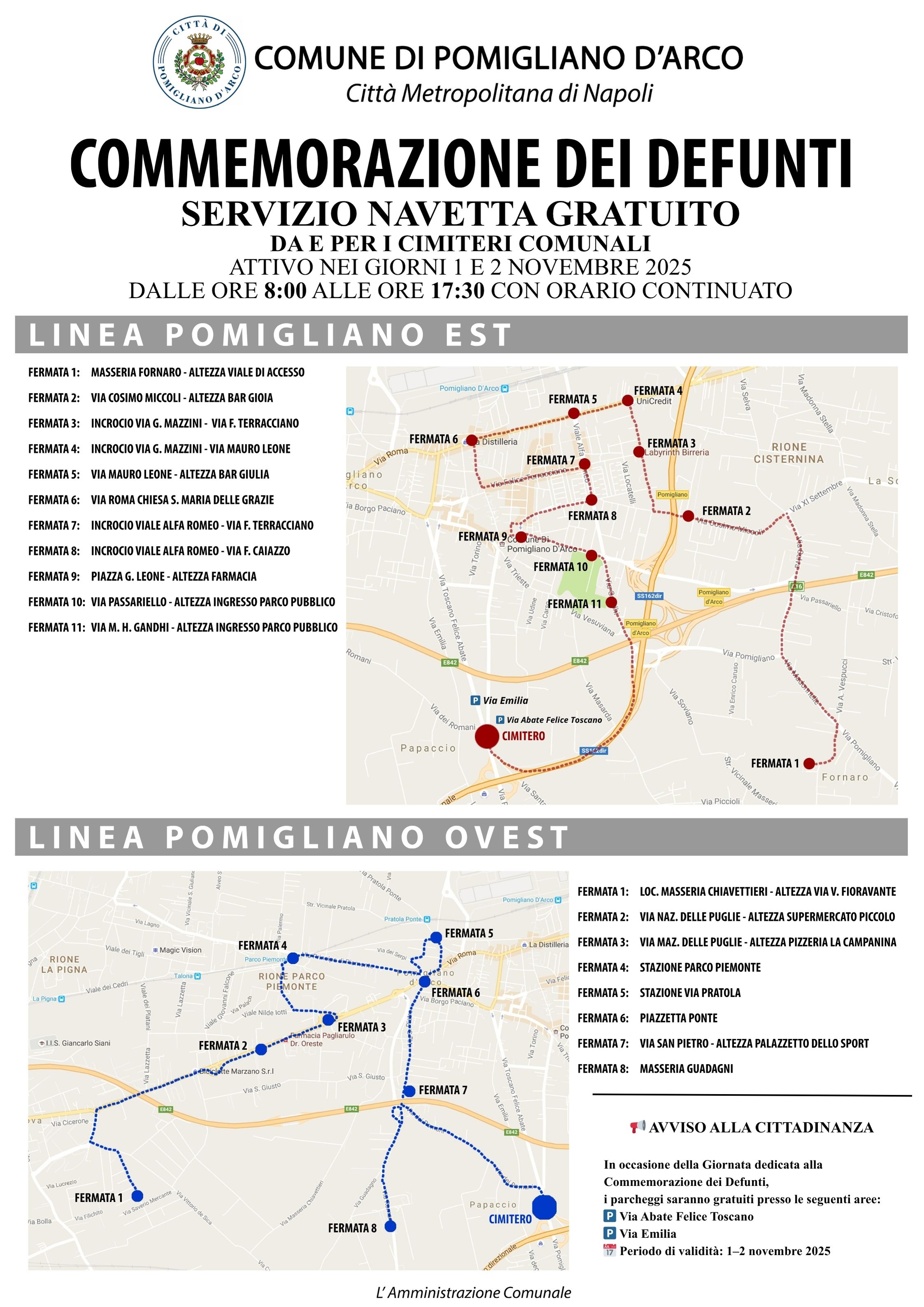 In occasione della Commemorazione dei Defunti, sarà attivo il servizio navetta secondo le modalità indicate nel manifesto allegato.