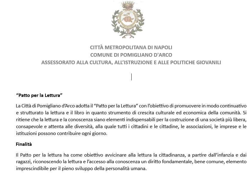 L’Ente informa la cittadinanza che, su iniziativa dell'Assessorato alle Politiche Culturali presieduto dal prof. Giovanni Russo e con la collaborazione degli istituti scolastici, biblioteche. istituti culturali, fondazioni , librerie, case editrici, associazioni ed enti del terzo settore del terriotrio, è stato ufficialmente sottoscritto il Patto per la Lettura, uno strumento strategico volto a promuovere il valore della lettura come leva fondamentale per lo sviluppo culturale, sociale ed economico del territorio.